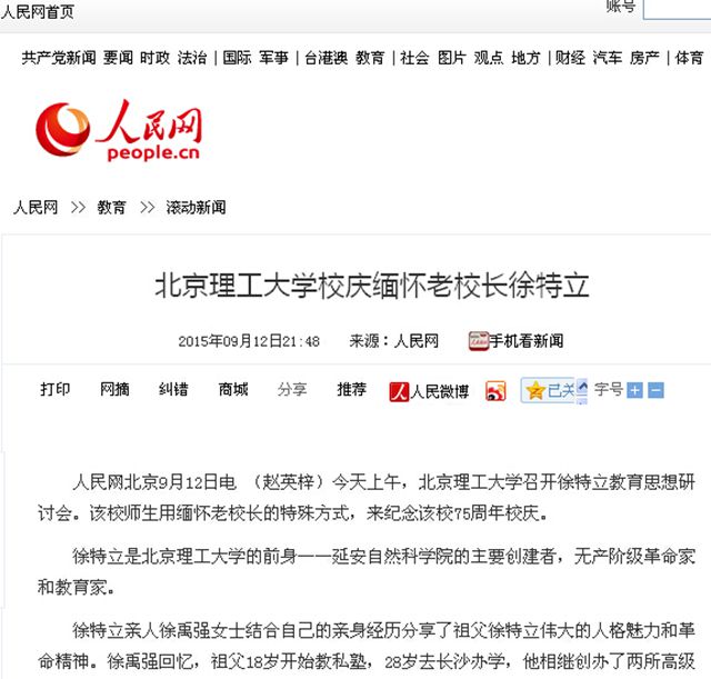 中新社北京9月12日電 (記者 馬海燕)北京理工大學12日舉行徐特立教育思想研討會。該校師生用緬懷老校長的特殊方式,來紀念該校75周年校慶。