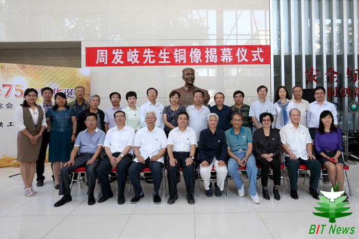 值此北京理工大學75周年校慶之際,9月19日中午,周發岐先生塑像揭幕儀式在北京理工大學5號樓一層大廳隆重舉行。出席揭幕儀式的學校領導和嘉賓有常務副校長楊賓、捐贈企業代表國營375廠副總經理韓長青、國營805廠副總經理賈云、周發岐先生的兒子周冬友、女兒周際平等家屬代表和其學生代表樊能廷、閻友清、史彥山等。學校相關職能部處、材料學院和化工學院的師生代表一同出席了揭幕活動。揭幕儀式由材料學院黨委書記陳鵬萬主持。